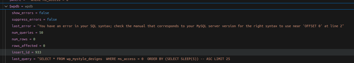 SELECT * FROM wp_mystyle_designs WHERE ms_access = 0 ORDER BY (SELECT SLEEP(5)) -- ASC LIMIT 25
