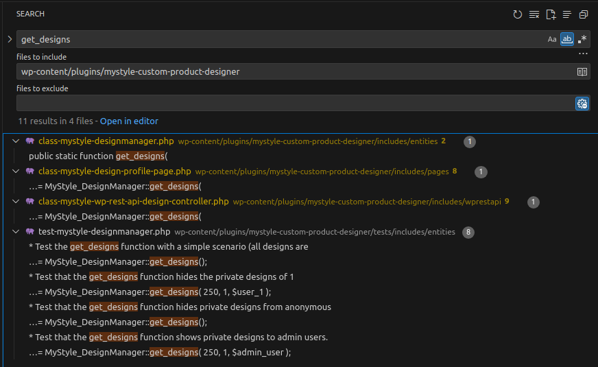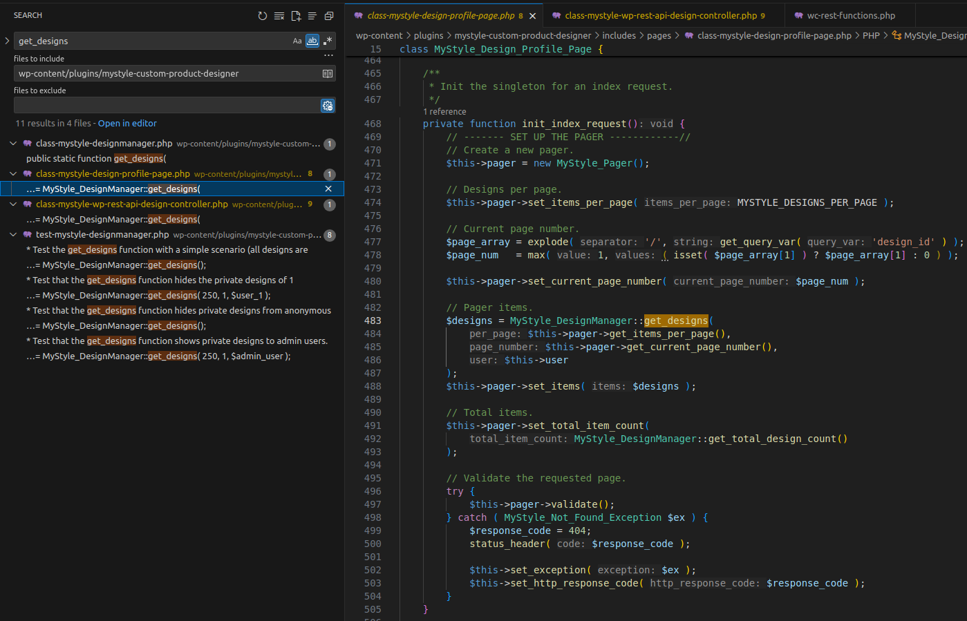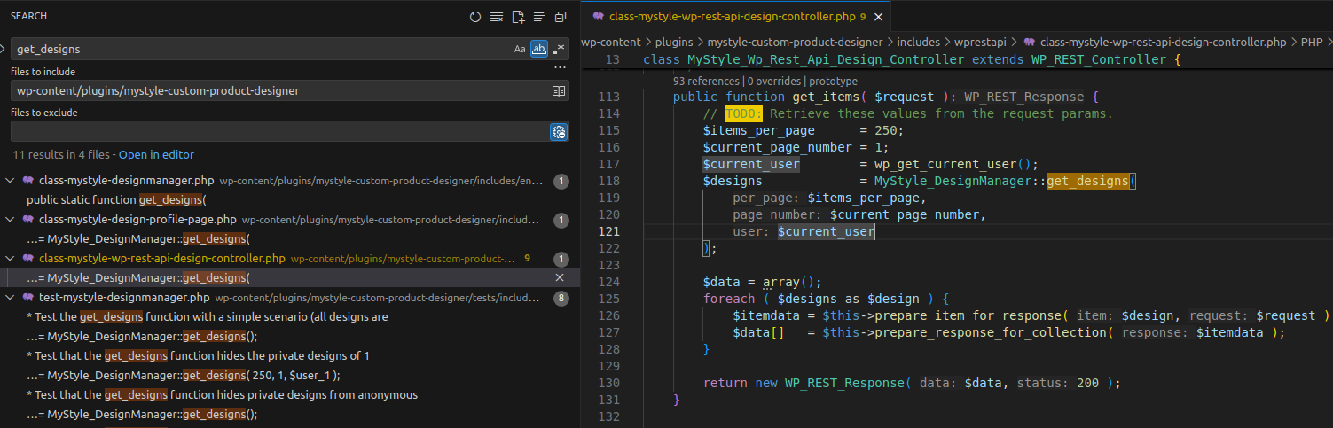 class (file includes/entities/class-mystyle-designmanager.php). To find where it is called, search for get_designs