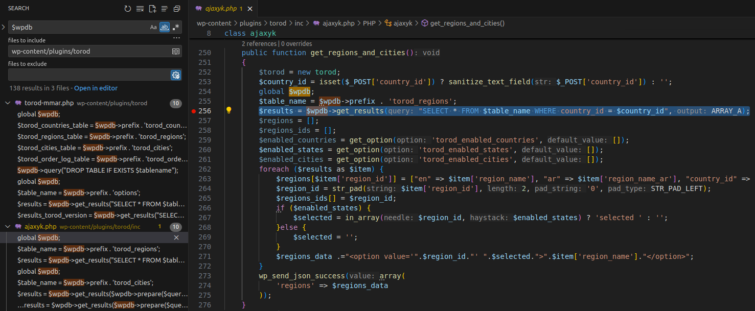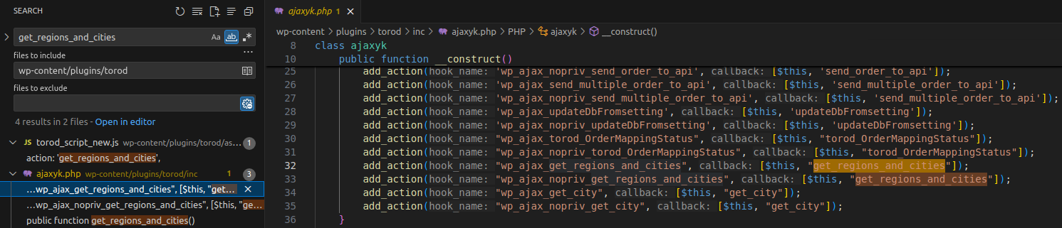 class within the inc/ajaxyk.php file. To determine where itโs called, we search for the keyword get_regions_and_cities