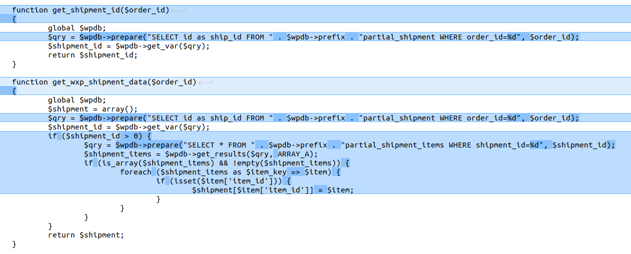 are two functions in the WXP_Partial_Shipment class that directly insert user input into SQL queries without validation, making them vulnerable to SQL Injection.
