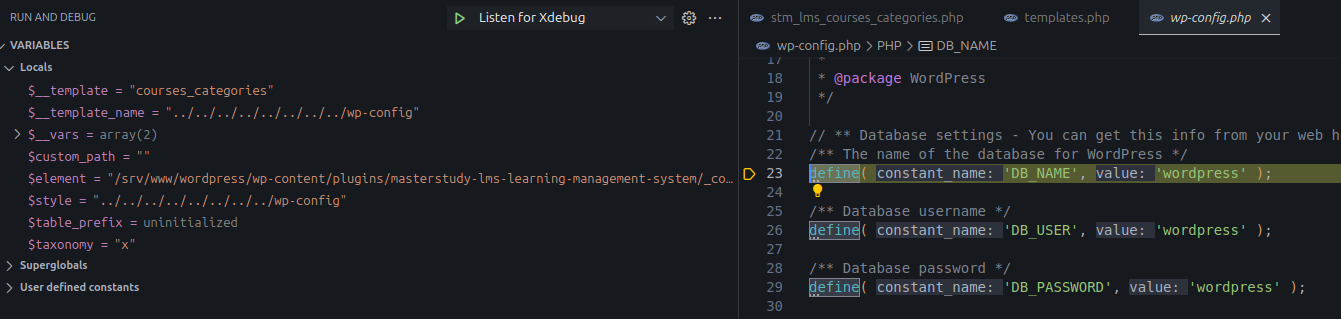 The debugger hits wp-config.php